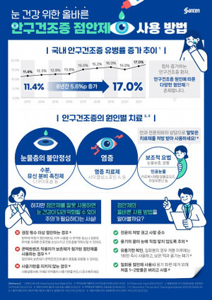 한국산텐제약이 건조해지는 환절기를 앞두고 안구건조증을 앓는 현대인의 안구 건강 증진을 위해 ‘올바른 안구건조증 점안제 사용 방법’ 인포그래픽을 22일 공개했다.국내 안구건조증 유병률은 2013년 11.4%에서 2021년 17.0%로 증가하는 추세를 보이고 있다[1]. 같은 기간 모든 연령 구간에서도 유병률은 증가하는 추세로 안구건조증 환자는 날이 갈수록 그 수가 늘어나고 있다.안구건조증 환자라면 점안제를 무심코 잘못 사용해 눈 건강이 악화될 수 있어 주의가 필요하다. △의료진의 권장 처방 횟수 이상 점안 시 일회용 점안제일지라도 안
