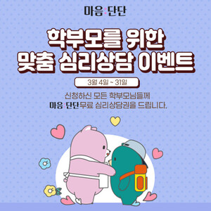 씨엘엠앤에스의 심리상담 전용 모바일 앱 ‘마음:단단’은 다양한 사회적 이슈에 대해 책임감을 갖고, 적극적으로 협력하기 위해 맞춤 심리상담을 진행하고 있다. 이에 신학기를 맞아 학부모들을 응원하고자 특별한 무료 심리상담 이벤트를 진행한다.이번 이벤트는 학부모를 대상으로 3월 1일부터 한 달 동안 진행되며, 구글폼을 통해 간단한 신청서를 제출하면 된다. 마음:단단은 준비할 것이 많은 신학기에 학부모들의 마음 관리에 보탬이 되고자 무료 심리상담 이벤트를 기획했다고 밝혔다.이벤트의 주요 상담 주제는 다음과 같다.첫 번째는 ‘자녀의 학교생활
