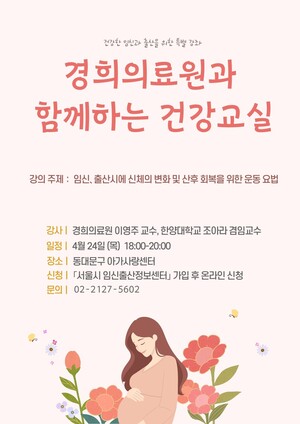 경희의료원이 오는 24일(목) 오후 6시에 동대문구 아가사랑센터에서 관내 임산부를 대상으로 한 건강 교실을 개최한다.
