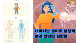 인간의 몸에는 약 400만 개의 땀샘이 있어 체온이 높아지면 땀을 분비하게 되는데, 이때 땀이 증발하면서 열을 빼앗아 체온을 낮추게 됩니다. 땀과 관련한 대표적인 질환은 땀띠가 있습니다. 땀띠는 땀이 배출되는 땀관이나 땀 구멍이 막힘으로써 발생하는 염증인데요. 주로 발진이나 홍반이 일어나며, 고온다습한 환경, 자외선 노출이 주된 원인입니다. 보통은 시원하고 쾌적한 환경에서 나아지지만, 심할 경우는 약물 치료가 필요합니다.다음은 교감신경계 이상으로 과도하게 땀이 나는 다한증이 있습니다. 보통은 손, 발바닥 등 부위에서 과도하게 땀이